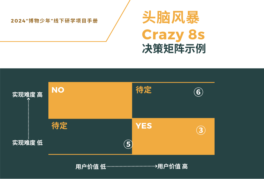 3. 生成创意 Ideate:通过Crazy 8s头脑风暴,一个小组最多提出了38个方案!其中就包括“历史人物贴纸”、“博物馆寻宝游戏”、“河南文化语音播报器”等点子。